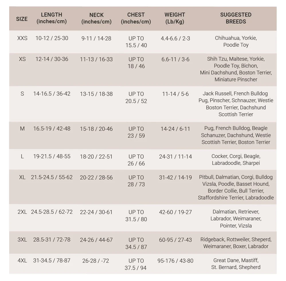 XS: Rückenlänge 30 – 36 cm, Halsumfang 16 – 33 cm, Brustumfang bis 46 cm, Gewicht 3 – 6 kg