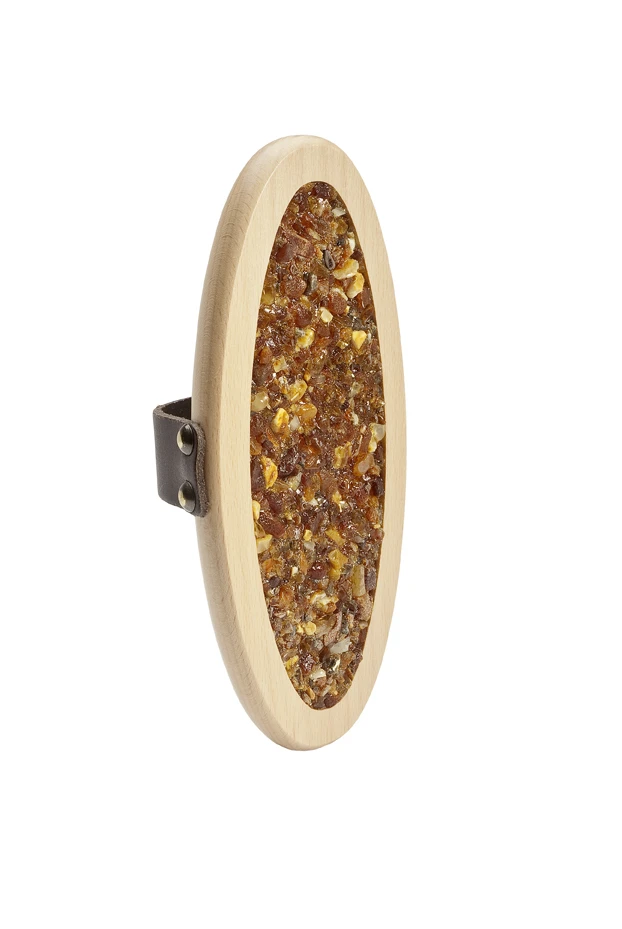 Ein Striegli ist eine Kardätsche aus Holz mit Lederschlaufe, bei der anstelle von Borsten echtes Naturbernsteingranulat mit chemiefreien Perlleim eingearbeitet wird*.