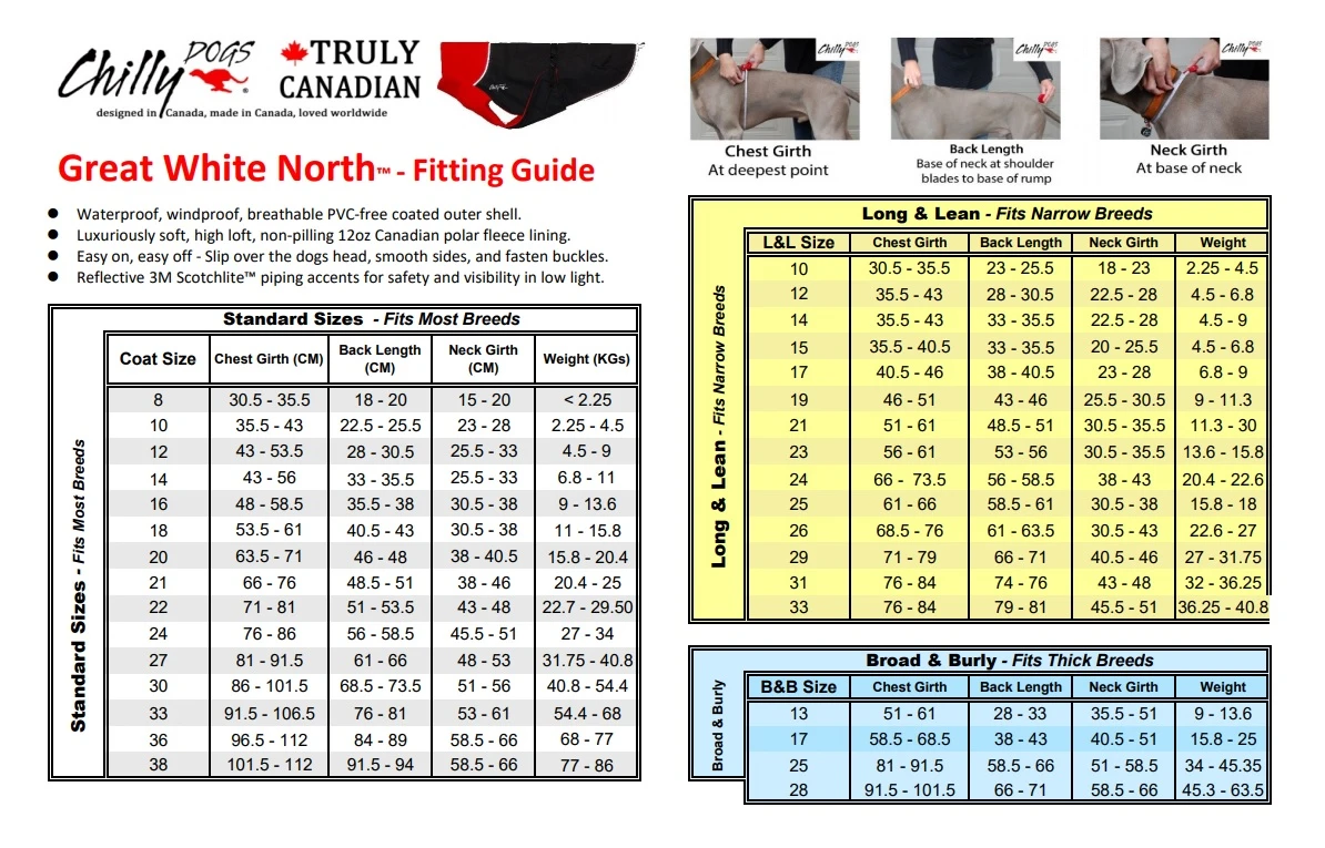 Der Great White North™ Wintermantel von Chilly Dogs aus Kanada bietet besten Schutz gegen extreme Wetterbedingungen. Er ist widerstandsfähig, wasserdicht, atmungsaktiv und schützt deinen Hund vor den Elementen während er ihm volle Bewegungsfreiheit erlaubt. Du kannst dich darauf verlassen, dass dein Hund sich wohl fühlt und gut geschützt ist während ihr beide euch voll und ganz zusammen auf eure liebsten Outdoor Winteraktivitäten konzentriert.