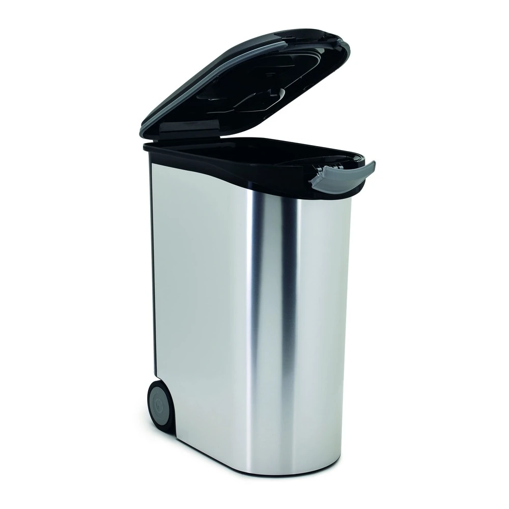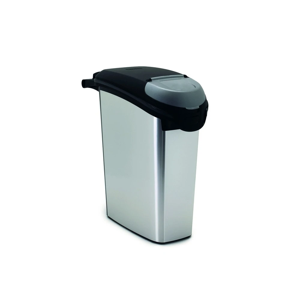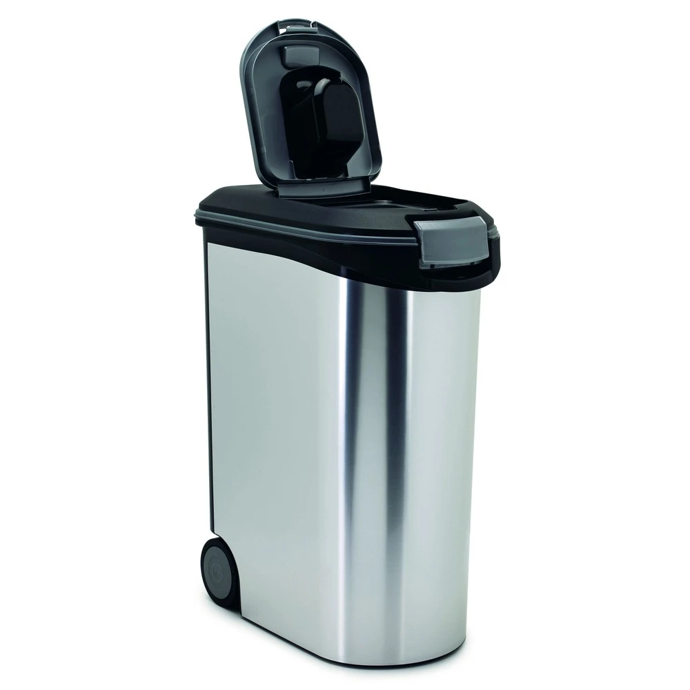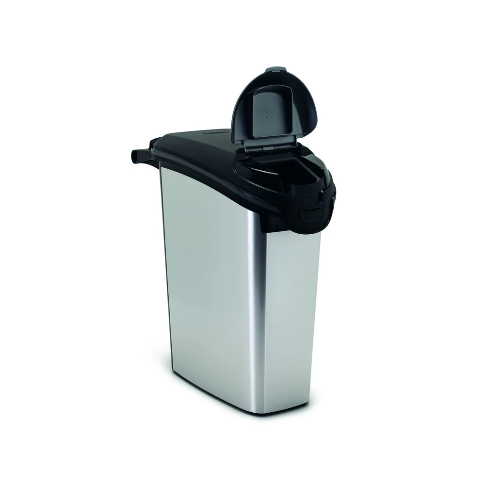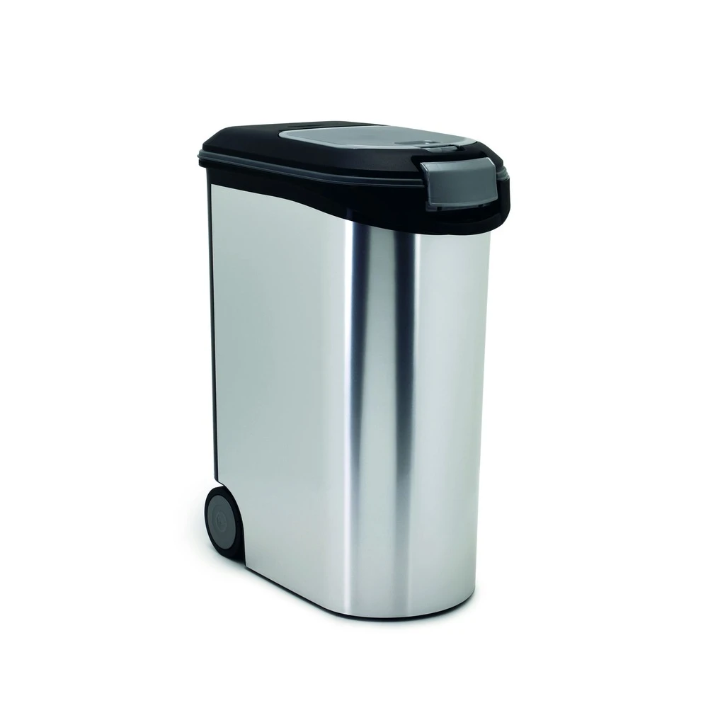 Aufbewahrungsbehälter für Trockenfutter, aus robustem Kunststoff, wertige Metall-Optik, luftdichter Verschluss, Futter bleibt länger knackig und frisch, separate Deckelöffnung
