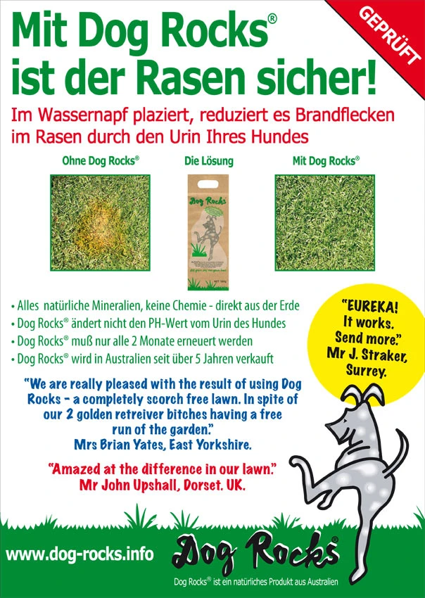 Dog Rocks® ist ein australisches Naturprodukt, welches die Brandflecken verhindert, die der Urin Ihres Hundes auf Ihrem Rasen hinterlässt. Dog Rocks ist ein in der Natur vorkommendes paramagnetisches Vulkangestein, welches dafür bekannt ist, den Gehalt von Bor, Barium, Mangan und Strontium im Wasser zu erhöhen und Zinn zu reduzieren.