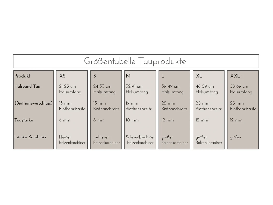 - Die Stärke des Taus und die Verschlussgröße sind abhängig von der Größe des Halsbandes (XS – XXL) und werden von Emmy&Pepe dementsprechend angepasst, abgebildet ist Größe M
