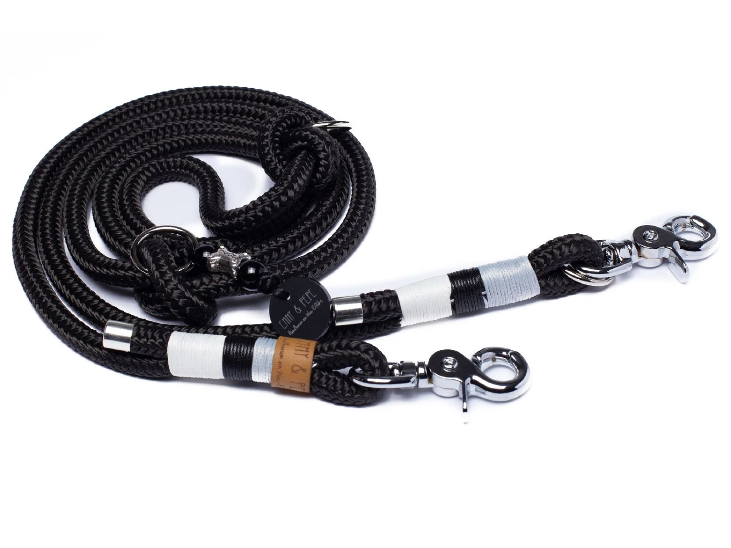 Eine Hundeleine muss nicht nur ein Stück Tau mit Schlaufe sein. Wir von EMMY & PEPE sind davon überzeugt, dass etwas praktisches gleichwohl auch etwas stilvolles sein kann. Unsere Leinen überzeugen durch schlichte Eleganz einerseits und Robustheit andererseits. Durch eingeknotete Ringe im Tau sind sie dreifach verstellbar und du kannst entscheiden, wieviel Freiraum dein Liebling haben soll. Getreu dem Wau-Effekt findest du an jeder Leine einen kleinen Perlenanhänger, der das Halsbandthema widerspiegelt. Unterschiedliche Hundegrößen haben unterschiedliche Bedürfnisse. Daher unterscheiden sich unsere Leinen in Tau- und Karabinerstärke damit für jede Hunderasse die optimale Hundeleine entsteht.