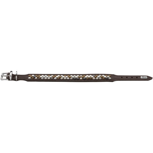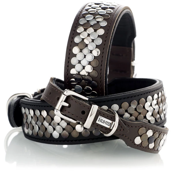 Das Halsband ARIZONA ist ein typisches HUNTER-Produkt: Hochwertiges Leder und beste Handwerkskunst ergeben ein Halsband, das trotz schlichter Form auch die Freunde des Besonderen begeistert – dank der luxuriös schimmernden Nietenverzierung. Robustes Softvollrindleder wird spezialgegerbt, durchgefärbt und geölt, um dann zu diesem schönen Halsband verarbeitet zu werden. Dank eben diesen weichen Leders und der sorgfältigen Verarbeitung ist das Halsband ARIZONA für Ihren Hund angenehm zu tragen, denn dank der sorgfältigen Verarbeitung gibt es nichts, was den Hals Ihres Hundes reizen kann. Eine innere Lage aus Rindnappa macht das Halsband noch zusätzlich weich und bequem. Das Halsband ARIZONA wird mit zahlreichen seidig schimmernden Nieten in verschiedenen Farben verziert. Diese Verzierung ist bei jedem Halsband anders, Sie halten also immer ein Unikat in den Händen.