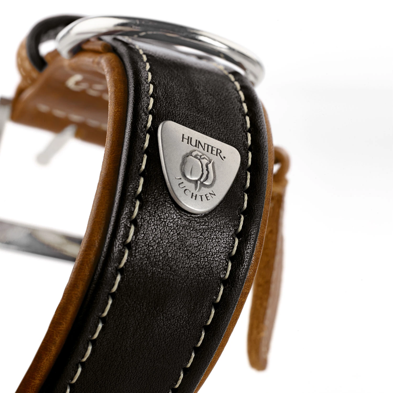 Die stufenlos verstellbare Halsung TARA basiert auf dieser alten Gerbtradition, die mit modernen, schonenden und rein pflanzlichen Mitteln wieder zum Leben erweckt wurde. Das Ergebnis ist ein schmutz- und wasserabweisendes Lieblingsstück, das trotz seiner Robustheit extrem geschmeidig anmutet. Der rostfreie Alu-Strong Verschluss garantiert durch das geringe Gewicht besonderen Tragekomfort und lässt sich spielend leicht öffnen und schließen. Kontrastreiche Ziernähte sowie der abnehmbare Schlüsselanhänger mit HUNTER Juchten-Logo vervollständigen den rustikalen Look dieses einmaligen Stücks.