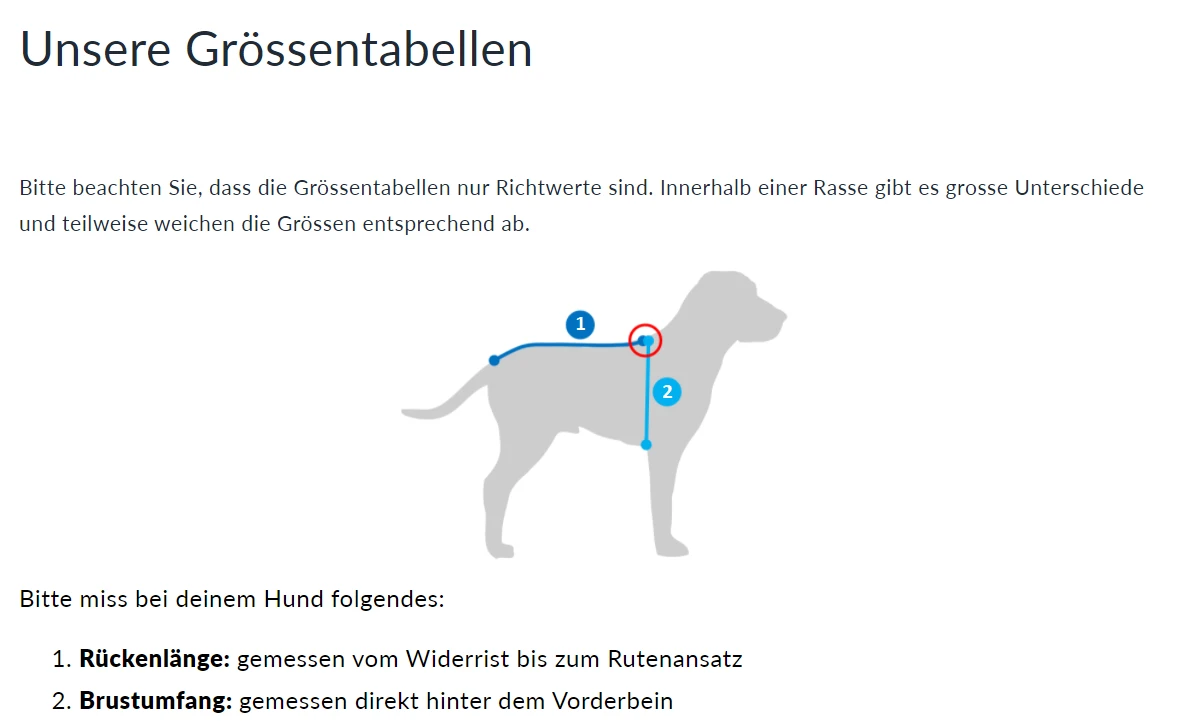 2. Brustumfang: gemessen direkt hinter dem Vorderbein