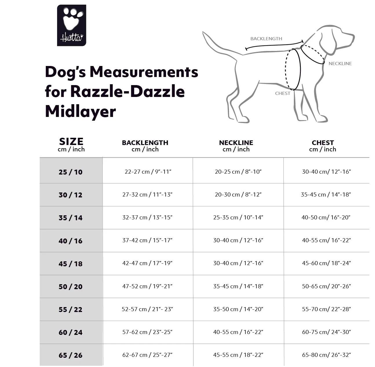 | Größe | Rückenlänge (cm) | Halsumfang (cm) | Brustumfang (cm) |