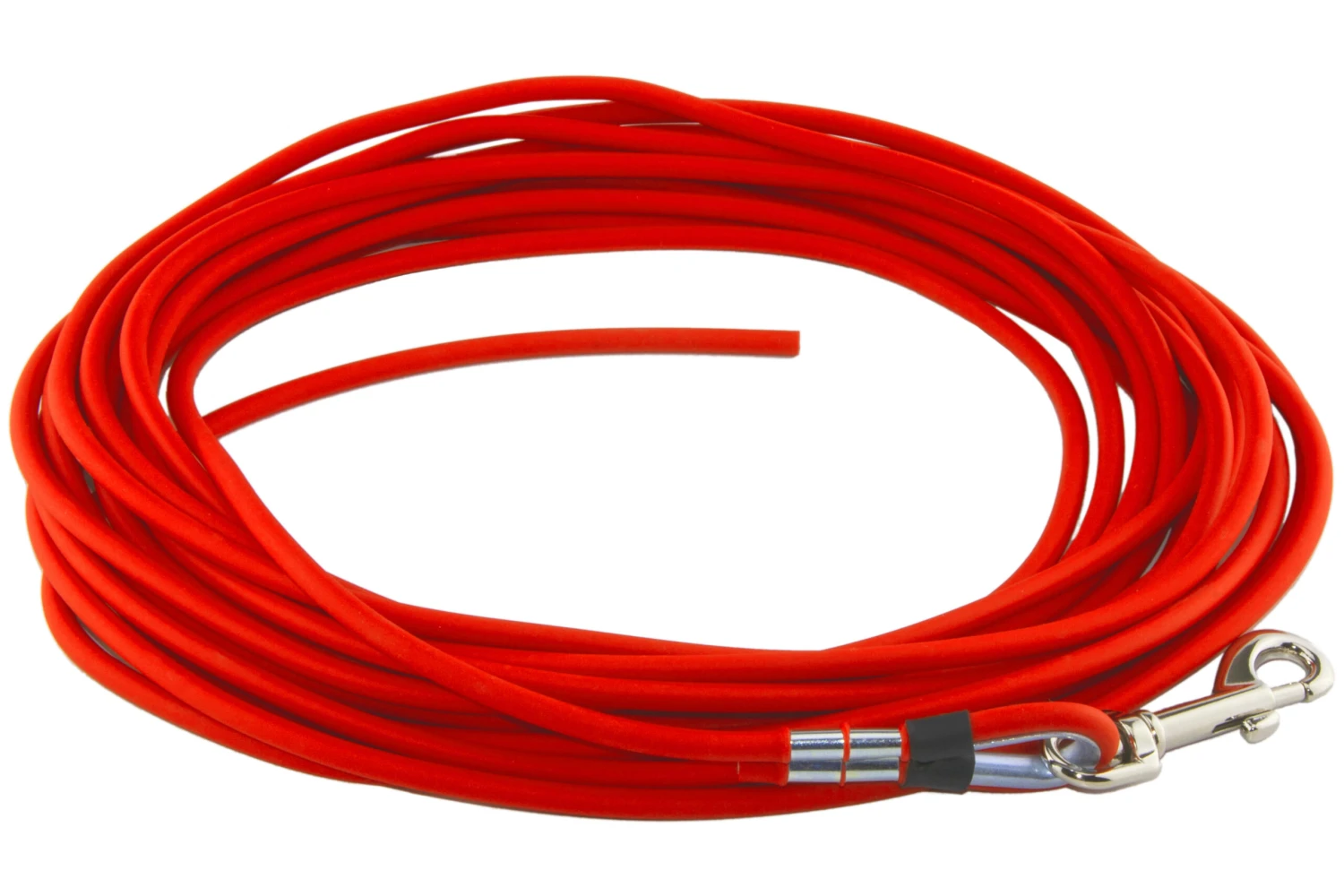 Hochwertige, handgefertigte BioThane® Schleppleine aus runder BioThane® in der Farbe Neon-Orange. Mit einem Durchmesser von ca. 6 mm bestens für Hunde zwischen 15 und 25 kg geeignet und somit eine Alternative zu flacher BioThane® mit 13 mm Breite. Durch die geringere Auflagefläche und eine etwas höhere Steifigkeit bieteten runde BioThane®-Schleppleinen noch bessere Gleiteigenschaften, lassen sich dafür aber etwas schlechter greifen.