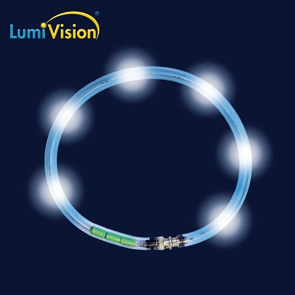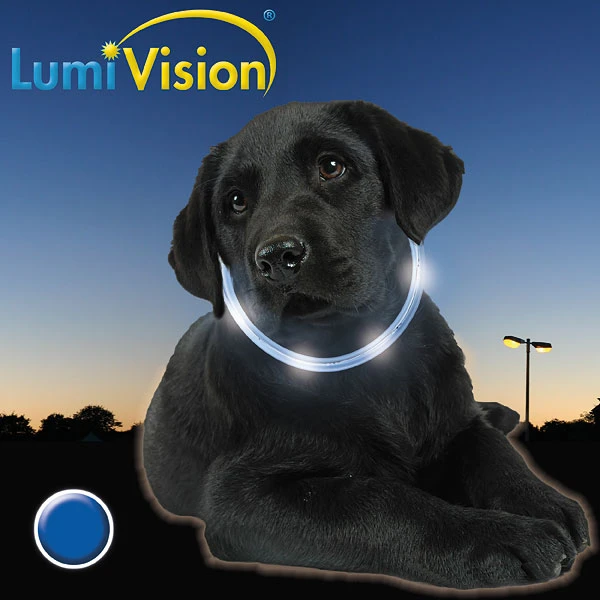 Aufladbares LED-Leuchthalsband für Hunde als perfektes Accessoire für den abendlichen Spaziergang bei Wind und Wetter.
