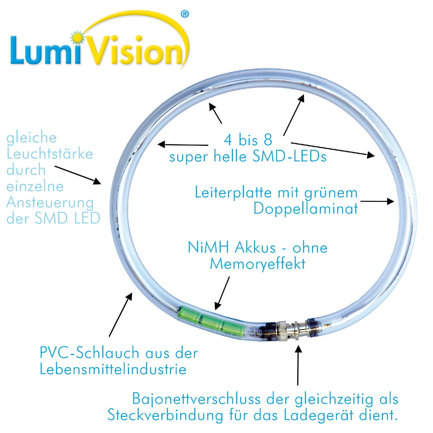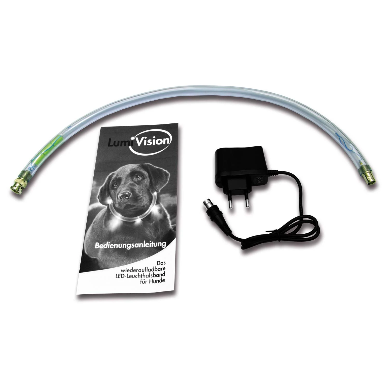 Aufladbares LED-Leuchthalsband für Hunde als perfektes Accessoire für den abendlichen Spaziergang bei Wind und Wetter.