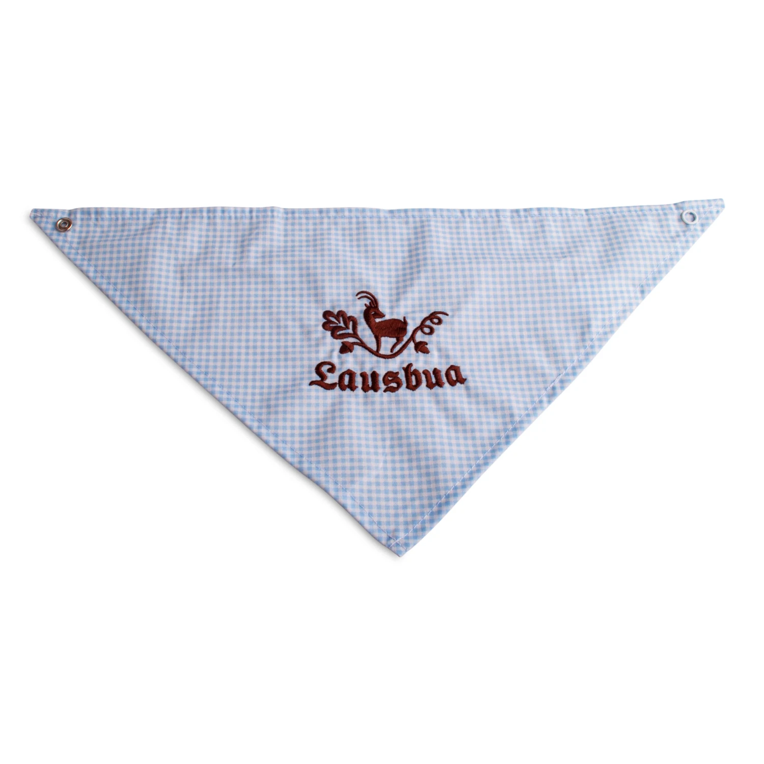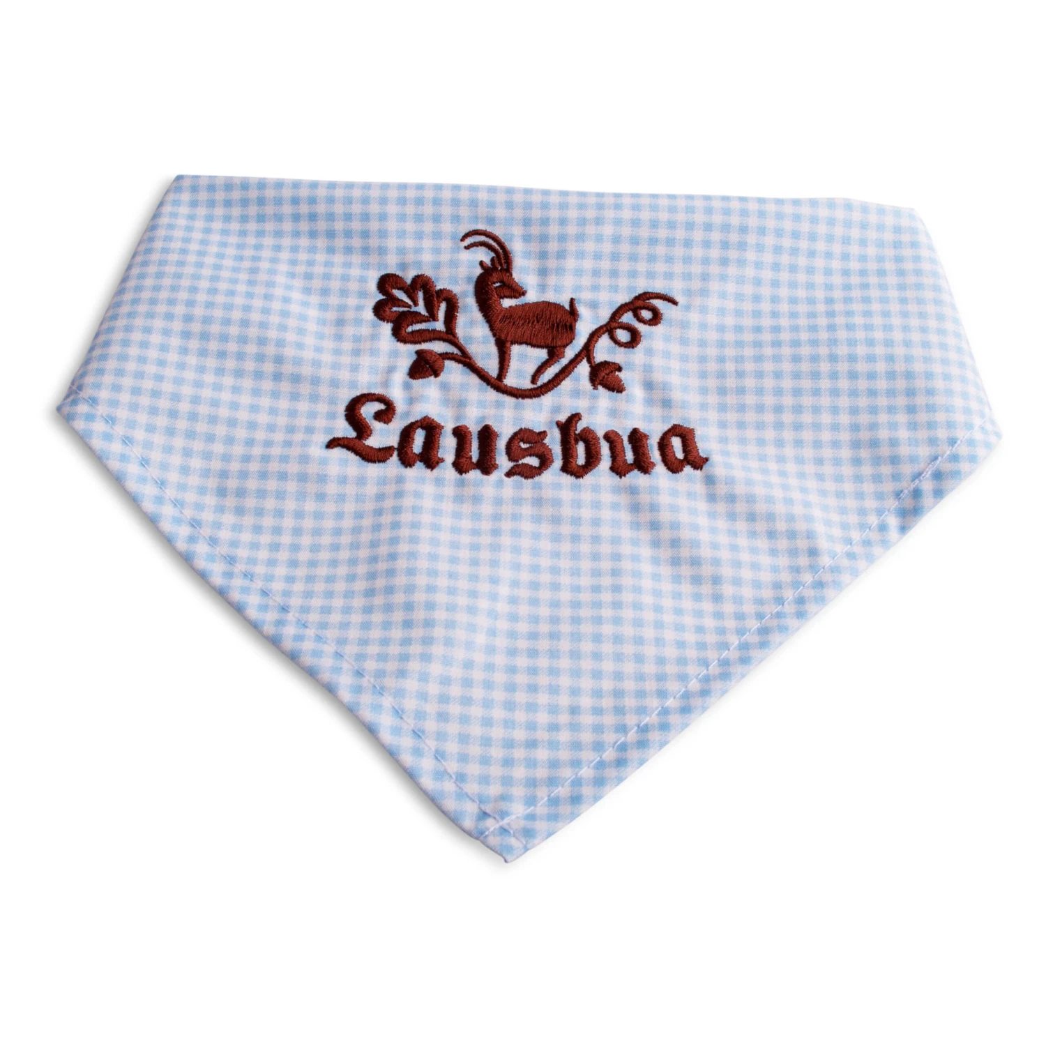 Süßes Dreieckstuch mit edlem Stick „Lausbua“ mit Hirsch auf weiß-blauem Karostoff. Sehr hochwertig verarbeitet mit bequemen Druckknopf. Das Tuch ist ca. 41 cm lang.