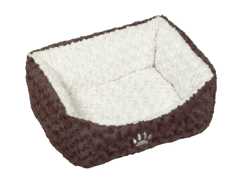 Das eckige Komfortbett „Neiku“ besteht aus besonders weichem Softplüsch (100% Mikrofaser), außen braun, innen weiß. Die Füllung aus Watte (Polyester) bietet einen besonders angenehmen Liegekomfort. „Neiku“ ist waschbar bei 30°C Handwäsche.