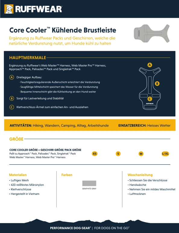 Der Ruffwear Core Cooler™ ist ein Einsatz für verschiedene Geschirre und Rucksäcke von Ruffwear. Mit Hilfe des Verdunstungseffekts hält der Core Cooler™ den Torso des Hundes kühl. Der Bauch- und Brustschutz hilft außerdem beim Anheben und Unterstützen des Hundes und stabilisiert zusätzlich die Rucksäcke und Geschirre.