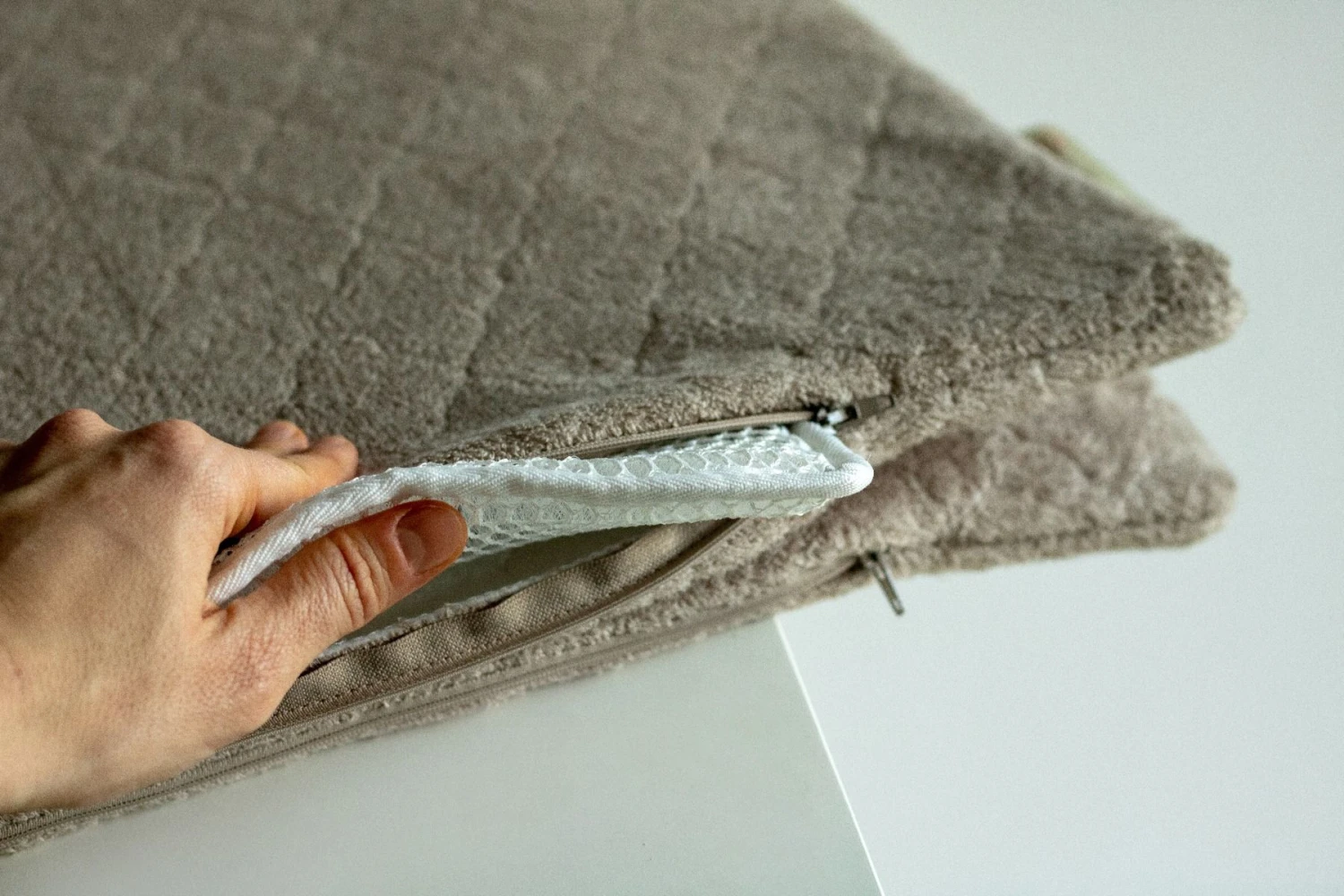 - Außenmaterial ist abnehmbar und maschinenwaschbar bei 30°C, Trockner geeignet bei geringer Hitze. Innenmaterial kann mit Hand mit lauwarmen Wasser gewaschen werden.