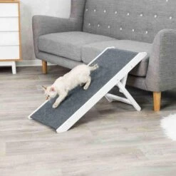 Rampe in weißer Lackierung und grauem Stoff. Erleichtert Deinem Vierbeiner, gewisse Höhen zu erreichen, ohne springen zu müssen.