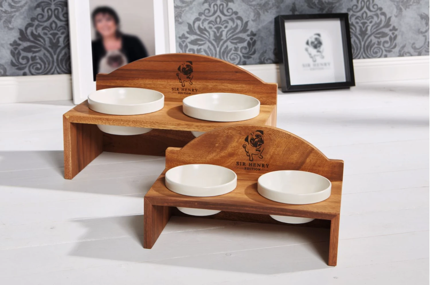 Diese Futterbar wurde extra für kurzschnäuzige Hunde konzipiert. Dank der angenehmen Höhe und den runden Porzellanschalen können Mops und Co. Futter und Wasser einfacher erreichen und ihr Festmahl ausgiebig genießen. Die eleganten Keramikschalen können dem robusten Vollholzkörper entnommen und in der Spülmaschine gereinigt werden. Kleine Silikonpunkte an den Füßen des Holzkörpers sorgen für einen sicheren Stand der Bar während des Fütterns. Das robuste Design bringt natürlichen Charme in jeden Einrichtungsstil und wird durch ein schönes Mopsemblem abgerundet.