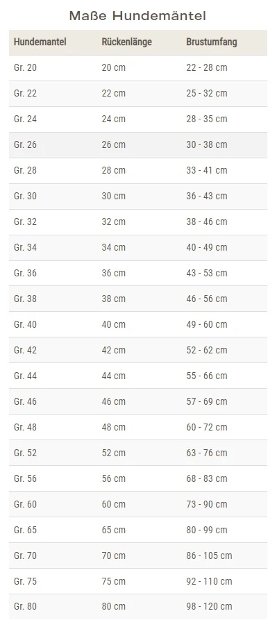 Der perfekte Sitz und die korrekte Größe des Hundemantels geben Deinem Hund ein hohes Maß an Komfort und Bewegungsfreiheit. Hierfür benötigst Du die Rückenlänge und den Brustumfang Deines Hundes. Der Rücken wird von den Schulterblättern bis zum Rutenansatz vermessen. Für ein genaues Messergebnis sollte Dein Hund gerade stehen. Die Bekleidung muss lang genug sein, um den Rücken optimal vor Kälte oder Nässe zu schützen, darf aber die Rute nicht bedecken oder den Hund in der Bewegungsfreiheit behindern. Den Brustumfang misst Du hinter den Vorderläufen an der breitesten Stelle des Brustkorbes. Eine Größentabelle findest Du in den Produktfotos. Die in der Auswahl angegebenen Größen beziehen sich auf die Rückenlänge.